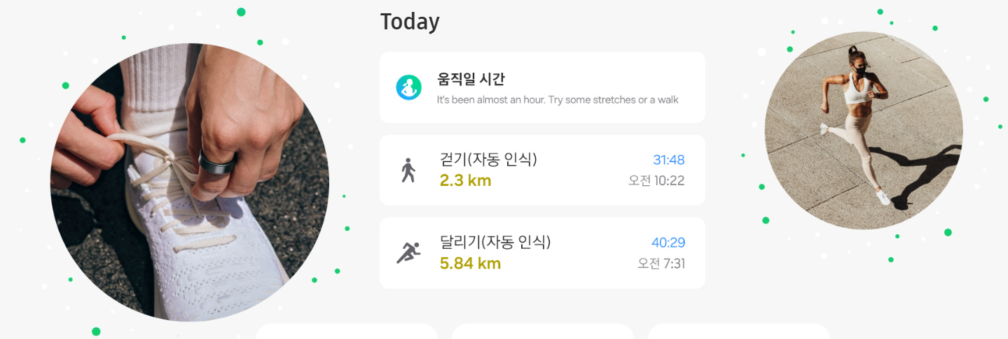따로 운동 시작 버튼을 누르지 않아도 갤럭시 링이 걷기와 달리기를 자동으로 측정합니다.