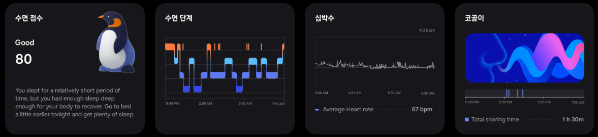 수면 중 심박수 및 심박 변이도까지 전반적인 수면을 모니터링합니다.