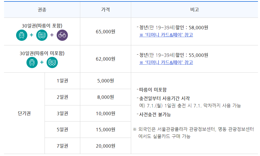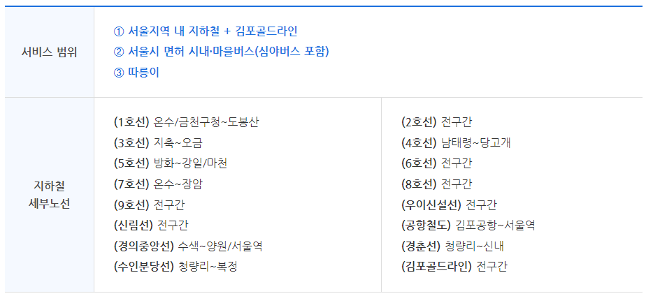 ☑️ 이용범위: 서울지역 지하철 + 김포골드라인, 서울시 면허 시내·마을버스, 따릉이