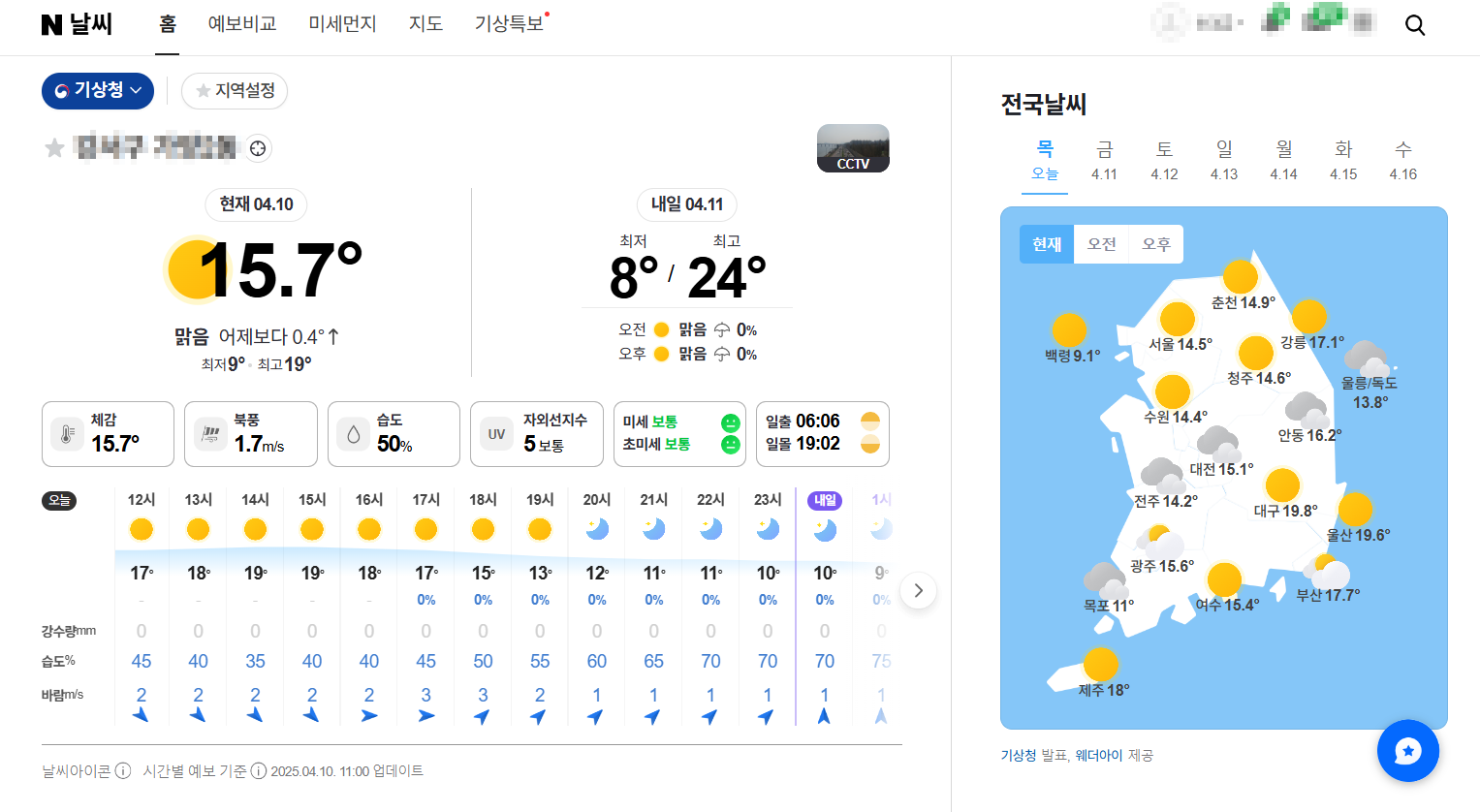 스마트폰 앱(AccuWeather, 네이버 날씨 등)이나 구글 검색을 통해 매일 아침 실시간으로 확인하는 것이 좋습니다.