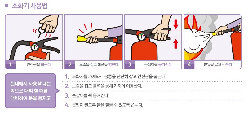 소화기를 사용할 때는 먼저 안전핀을 뽑고, 분사 노즐을 불 쪽으로 향하게 한 후, 손잡이를 눌러 분사합니다. 이때, 바람의 방향을 고려해 안전한 위치에서 사용해야 해요. 화재가 발생했을 때는 신속하게 대처하는 것이 중요하니, 평소에 소화기 사용법을 숙지해 두는 것이 좋습니다.