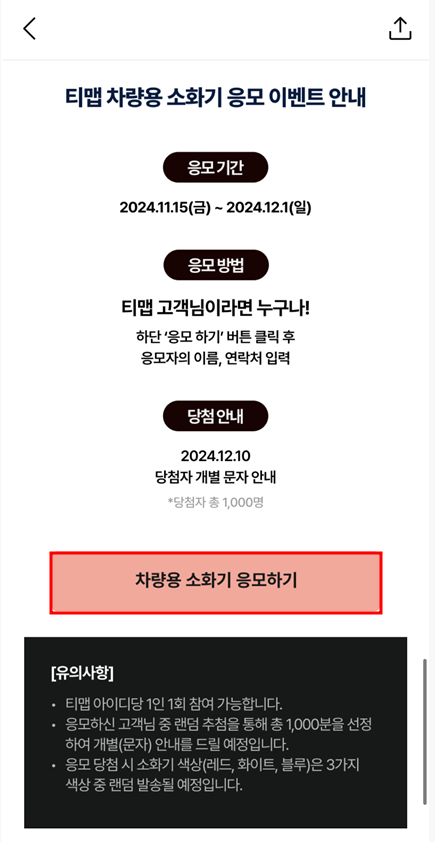 이벤트 응모 기간은 오늘부터 12월 1일까지이며, 내달 10일 응모자 중 1,000명을 선정해 발표할 계획인데요. 당첨 내용은 문자로 참가자에게 개별 안내되고, 이후 차량용 소화기가 순차적으로 배송됩니다.