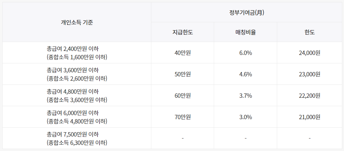 * 육아휴직급여(육아휴직수당) 또는 군 장병급여만 있는 경우, 총급여 기준을 준용하여 정부기여금 매칭비율 산정