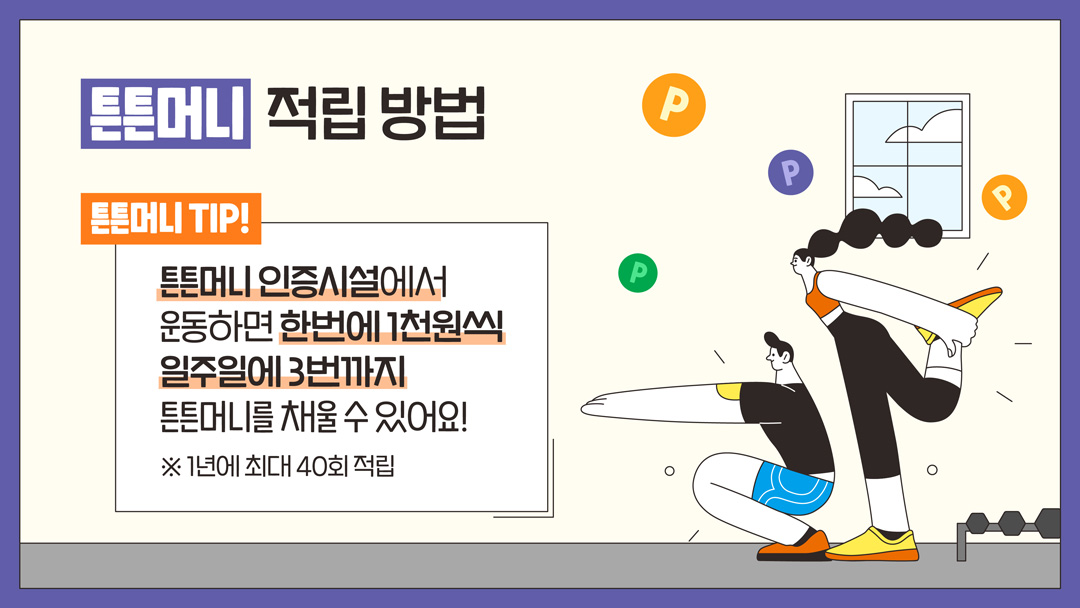 ☑️ 가까운 튼튼머니 인증시설을 검색해보세요. 인증시설에서 30분 이상 운동하고 QR코드로 인증하면 스포츠활동 참여 포인트 1,000P가 적립됩니다.