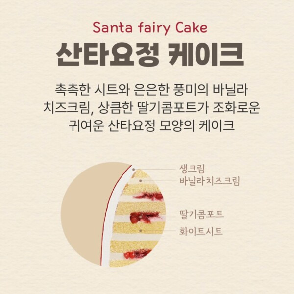 촉촉한 시트와 은은한 풍미의 바닐라 치즈크림 & 상큼한 딸기콤포트🍓가 들어간 귀여운 산타요정 케이크를 만나보세요!