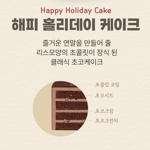해피 홀리데이 케이크는 클래식한 초코 케이크로, 가격은 29,000원에서 23,200원으로 할인됩니다. 지름 17cm의 이 케이크는 리스 모양의 초콜릿이 장식되어 있어 크리스마스의 분위기를 한껏 더해줍니다. 초콜릿 코팅과 초코시트, 초코크림으로 구성되어 있어 초콜릿 애호가들에게 특히 추천하고 싶어요.