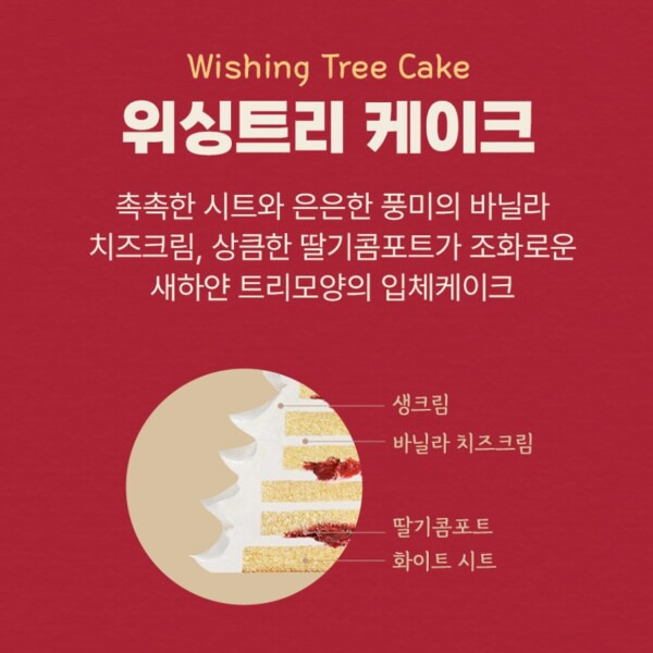 위싱트리 케이크는 가격이 36,000원에서 28,800원으로 할인되며, 18cm의 입체적인 트리 모양을 하고 있어요. 촉촉한 시트와 은은한 바닐라 치즈크림, 상큼한 딸기 콤포트가 조화를 이루어, 크리스마스의 분위기를 한껏 더해줍니다. 이 케이크는 시각적으로도 매력적이며, 맛도 훌륭해 크리스마스 파티에 적합합니다.